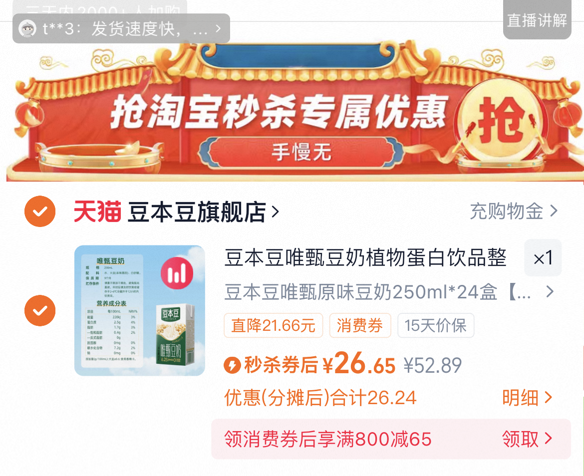 下拉详情拍,26.6亓,折1亓/盒 【豆本豆】豆奶250ml*24盒 发报员 2025年11月23日 21:33 0 举报 下拉详情拍,26.6亓,折1亓/盒【豆本豆】豆奶250ml*24盒https://m.tb.cn/h.SD7mzvJ 复制文案