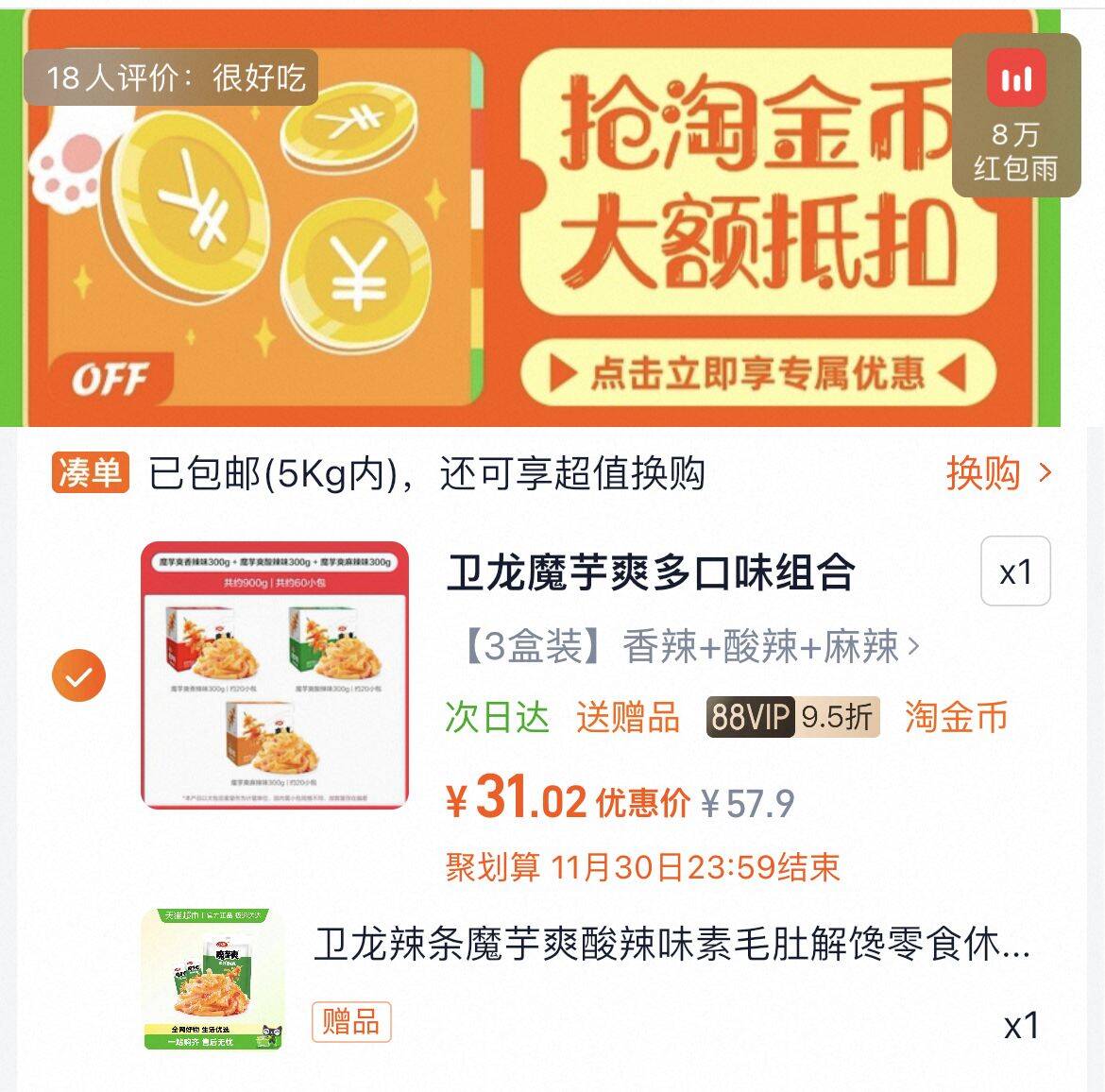 下拉详情拍 31亓,折10亓/盒 现在下單还贈 180g 发报员 2025年11月24日 01:08 0 举报 下拉详情拍31亓,折10亓/盒现在下單还贈 180g 卫龙辣条魔芋爽300g*3盒 https://m.tb.cn/h.SDkVEV0 复制文案