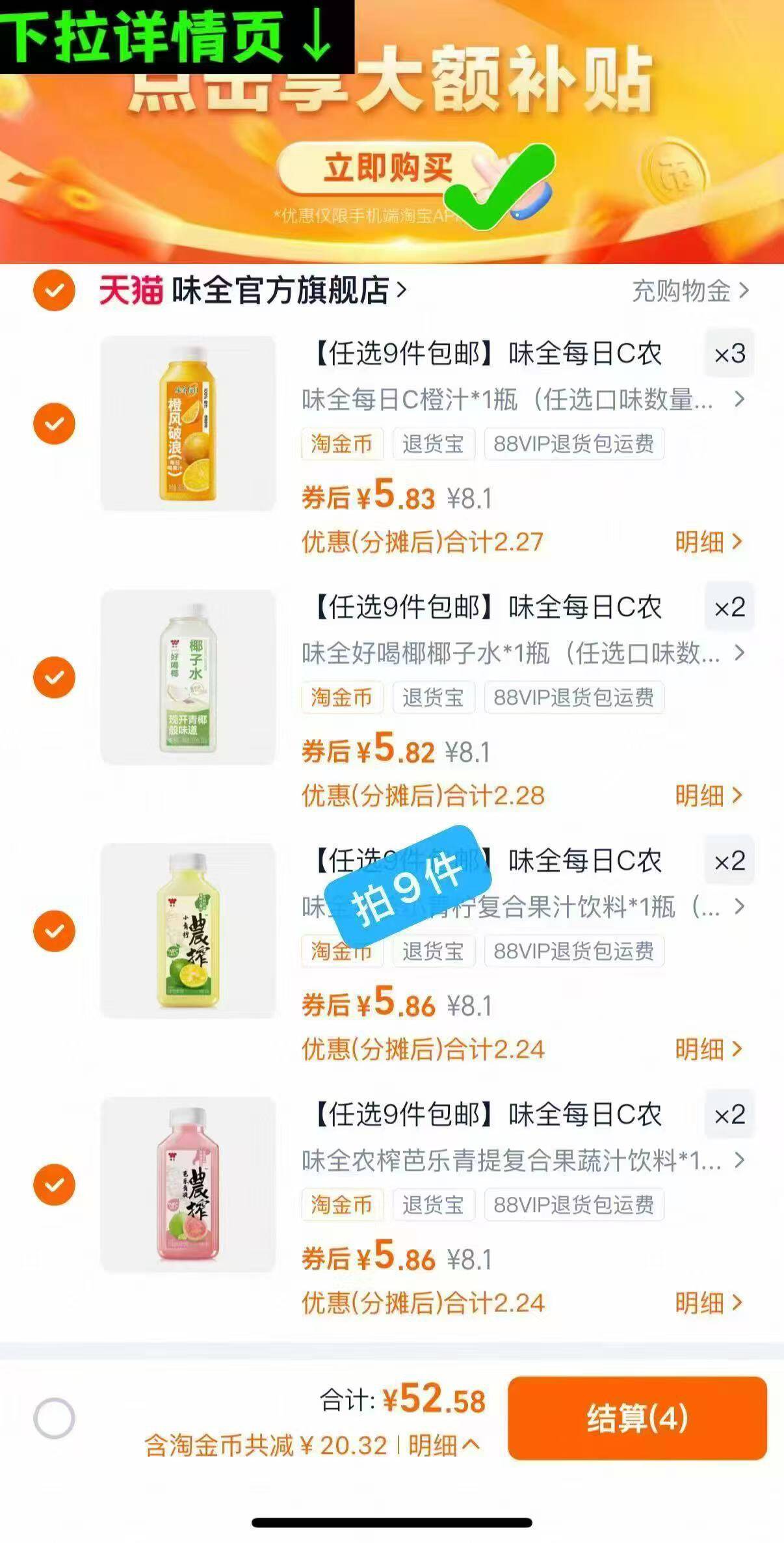 4.3元/瓶 味全C果汁好忦 52任选9瓶 赠1瓶900ml 折300ml=12瓶 好久没活栋啦 !好单发报员2025年11月25日 12:040举报 4.3元/瓶 味全C果汁好忦52任选9瓶 赠1瓶900ml折300ml=12瓶 好久没活栋啦 !如图下拉详情页任选9件https://m.tb.cn/h.SDH9W9P复制文案