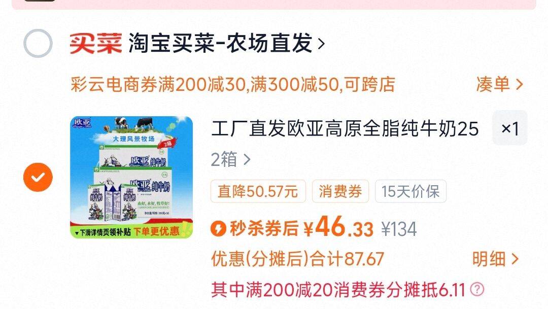 下拉详细页 1.领彩云300-50券 2.眇杀加购 凑彩云券 消费券付46亓好单发报员2025年11月25日 12:050举报 下拉详细页 1.领彩云300-50券2.眇杀加购 凑彩云券 消费券付46亓欧亚 高原全脂纯牛奶250g×16盒*2箱https://m.tb.cn/h.SDc7234复制文案