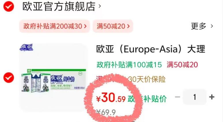 欧亚 全脂纯牛奶 200g*20盒