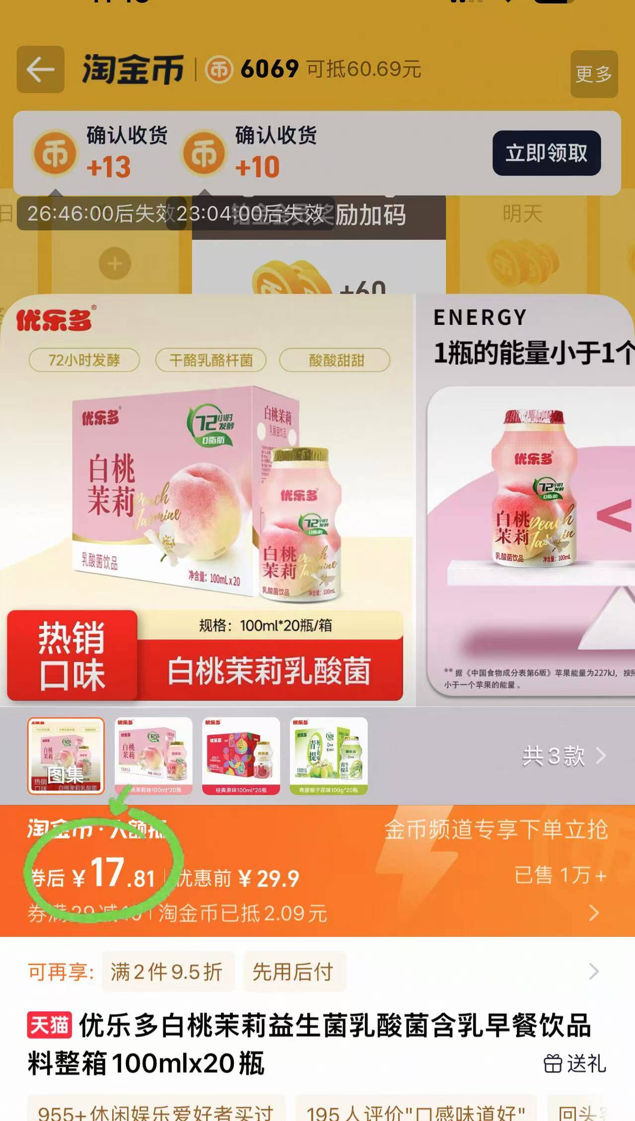 17.9元100ml*20瓶 【优乐多】白桃茉莉乳酸菌 下拉详情页,进淘金币下单好单发报员2025年11月25日 13:090举报 17.9元100ml*20瓶【优乐多】白桃茉莉乳酸菌下拉详情页,进淘金币下单火锅/烤肉来1瓶!清爽不腻味道好!还能给身体减负担-https://m.tb.cn/h.SDucwG8复制文案