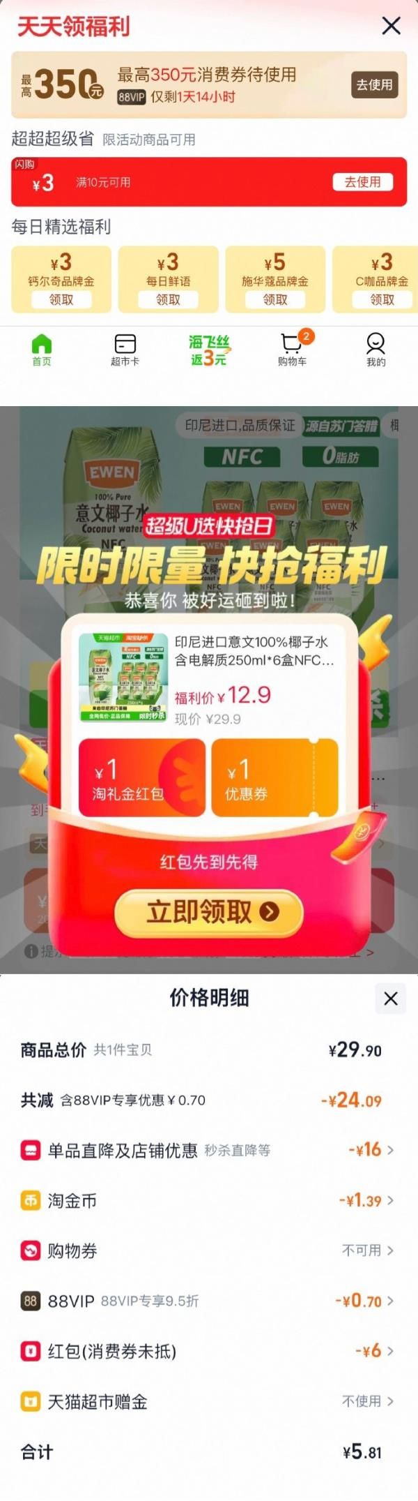 超市首页底栏点“去领取”,部分有10-3红包 (如有10-6红包到手更低)