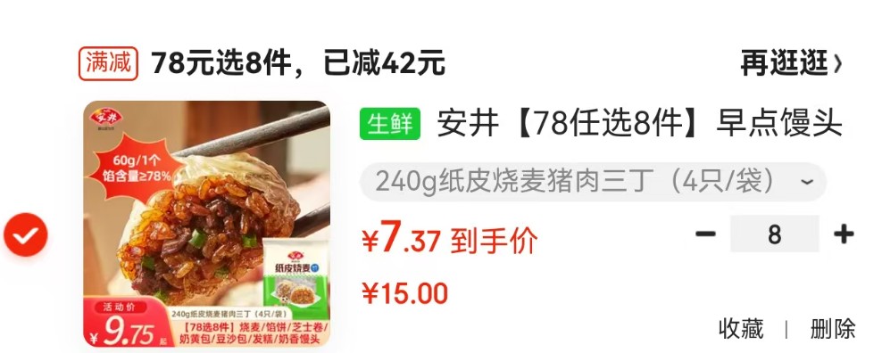 安井 早点馒头小笼包奶黄包纸皮烧麦牛肉饼等 ,任选8件 折7.3/件