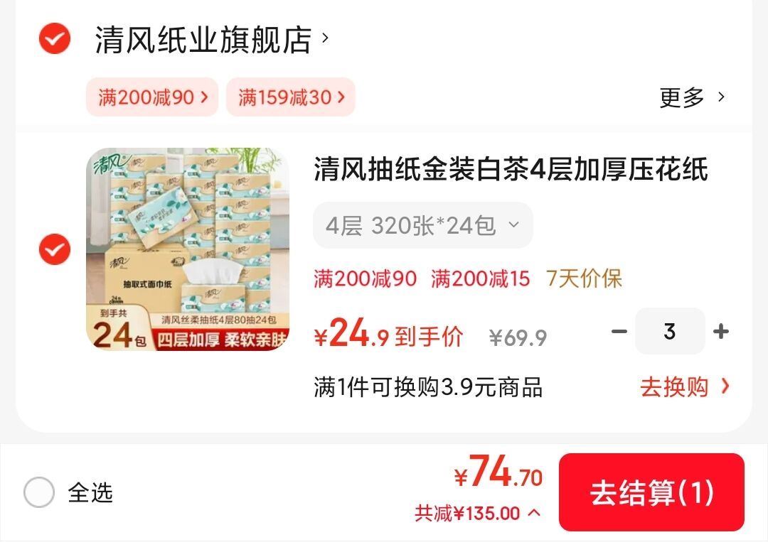 1元/包!加厚抽纸! 领补贴 清风 丝柔抽纸整箱4层320张*24包 好单发报员 2025年12月04日 09:12 0 举报 1元/包!加厚抽纸!领补贴https://u.jd.com/Zrtn0aq 清风 丝柔抽纸整箱4层320张*24包https://u.jd.com/ZDt5l8r 拍3件共72包实付74.7元! 复制文案