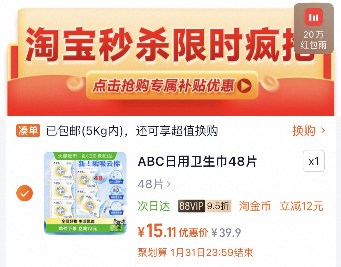 下拉详情拍,15亓 ABC日用棉柔卫生巾48片