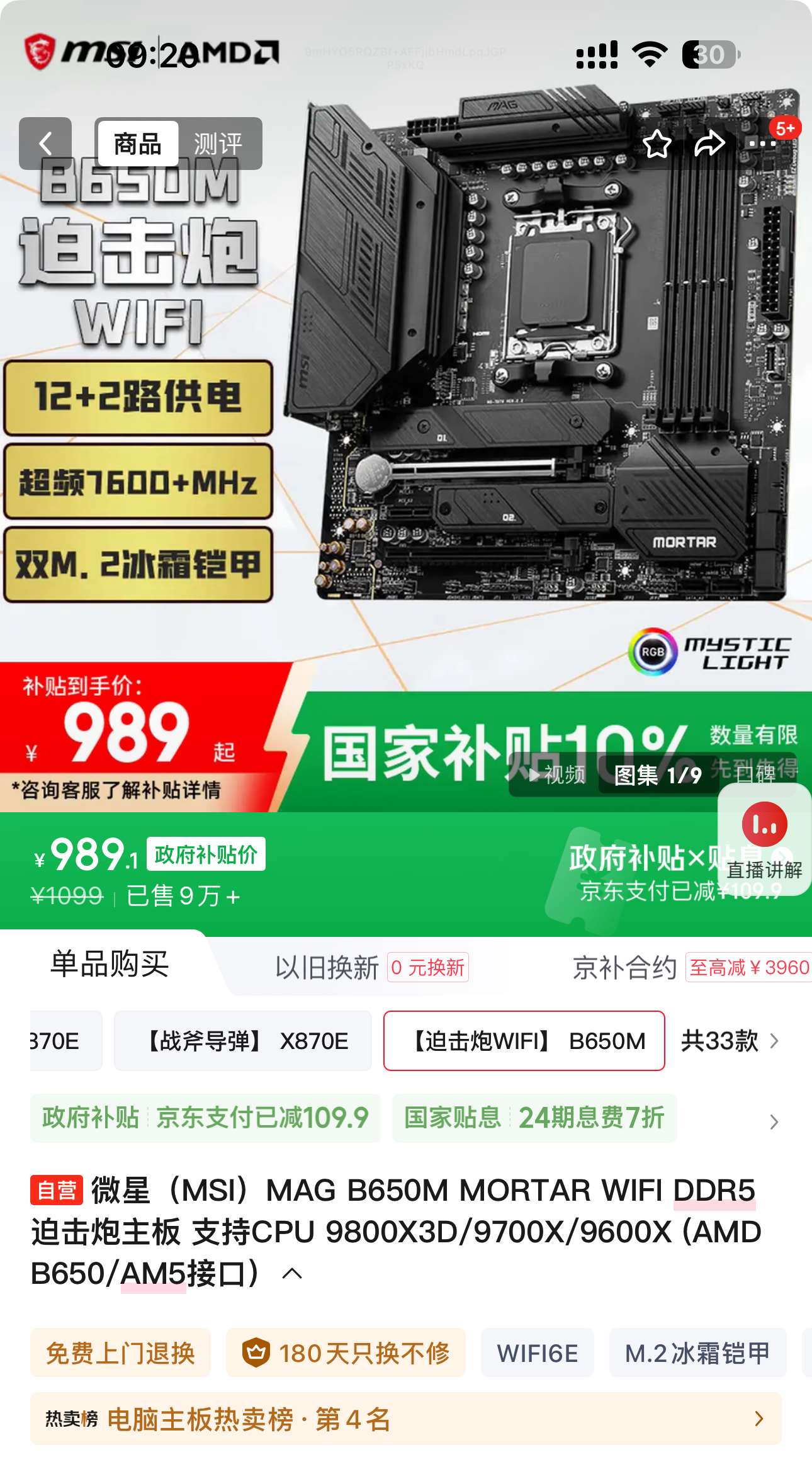 【989】微星MAG B650M MORTAR WIFI DDR5迫击炮主板 支持CPU 9800X3D/9700X/9600X ¥AMD B650/AM5接口) https://u.jd.com/ZDM1VMQ