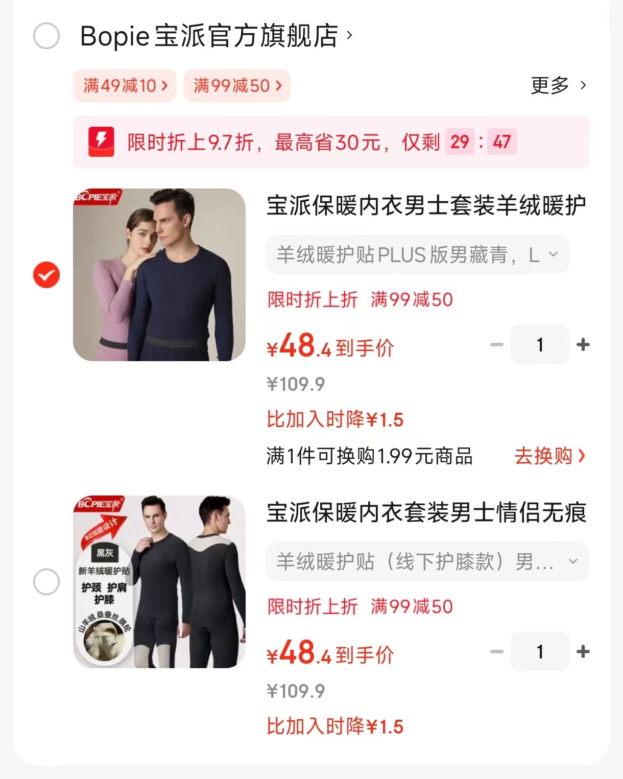 宝派 保暖内衣男士套装 羊绒暖护贴PLUS版【48.4】