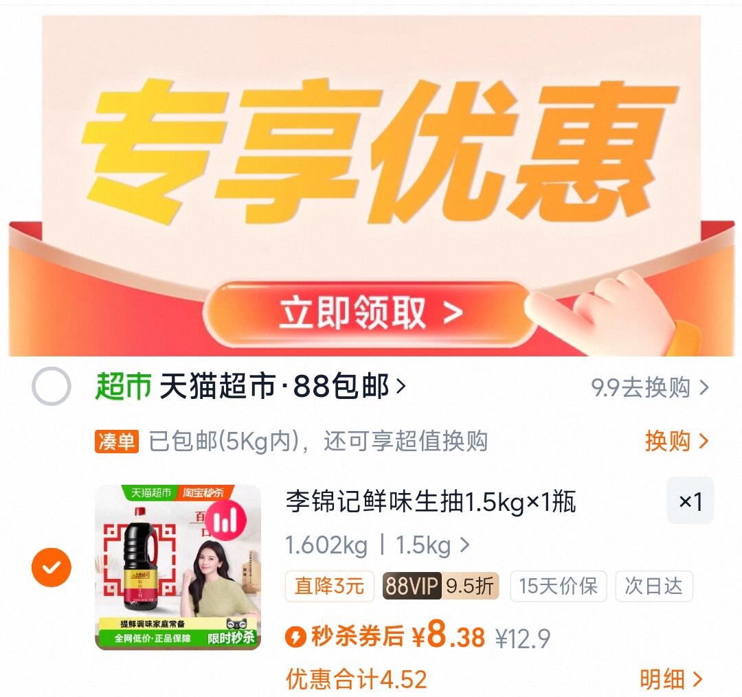 下拉详情拍,88vip 8.3亓 李锦记鲜味生抽酱油 1.5kg 好单发报员 2025年12月05日 16:55 0 举报 下拉详情拍,88vip 8.3亓李锦记鲜味生抽酱油 1.5kghttps://m.tb.cn/h.705bZIo 复制文案