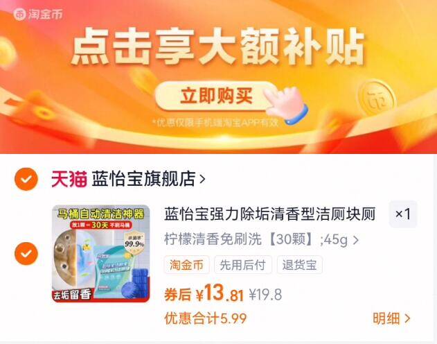 0.4亓/枚神圿下拉拍13.8亓 蓝怡宝 洁厕宝45g*30枚 去污除异味!家庭必备 好单发报员 2025年12月06日 14:45 0 举报 0.4亓/枚神圿下拉拍13.8亓【蓝怡宝】洁厕宝45g*30枚去污除异味!家庭必备https://m.tb.cn/h.70wbarA 复制文案