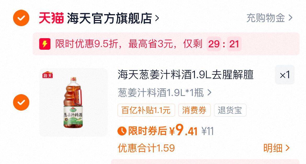 9.4亓 海天 葱姜汁料酒1.9L大桶