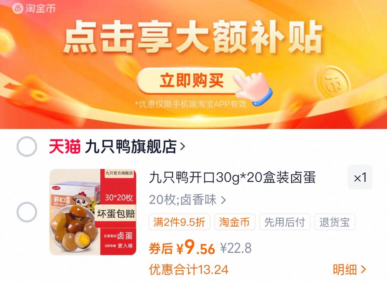 下拉详情拍,9.5亓 九只鸭 五香味卤鸡蛋20枚 好单发报员 2025年12月07日 15:09 0 举报 下拉详情拍,9.5亓【九只鸭】五香味卤鸡蛋20枚https://m.tb.cn/h.70JGvoR 复制文案