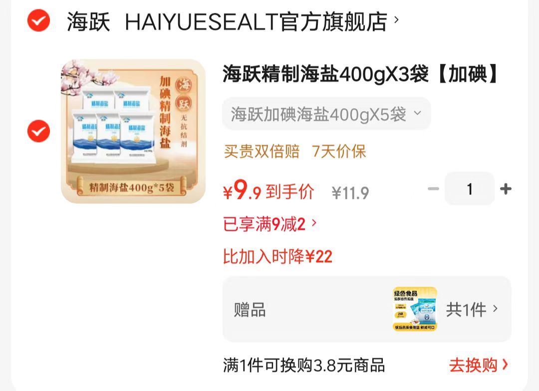 9.9元包邮 折1.4元/包! 海跃 日晒精制海盐400g*7袋 大包装更划算 无抗结剂更放心 好单发报员 2025年12月09日 11:27 0 举报 9.9元包邮 折1.4元/包!海跃 日晒精制海盐400g*7袋https://u.jd.com/ZDaSVOD 大包装更划算 无抗结剂更放心 复制文案