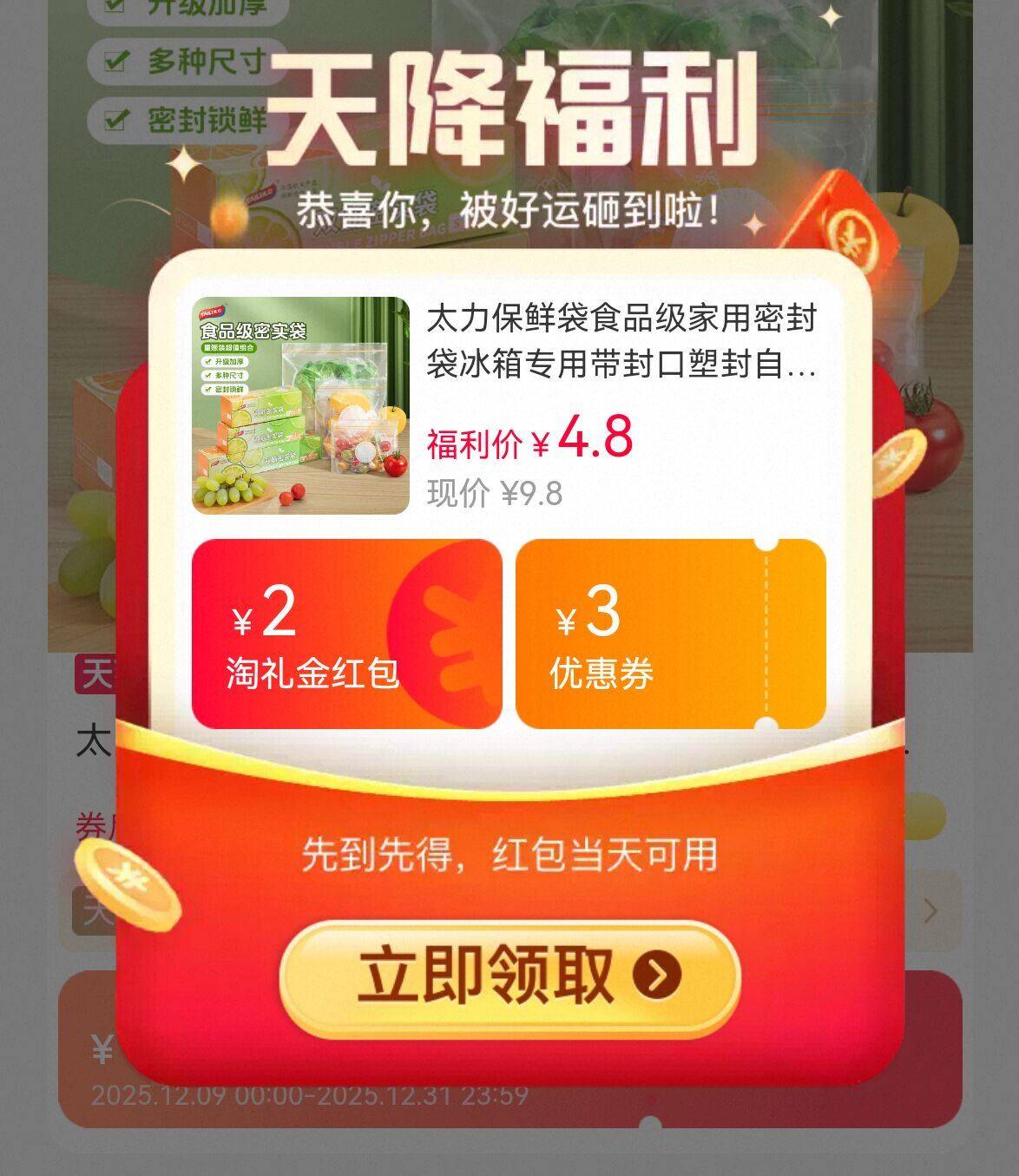 4.8亓天降礼金补贴 太力食品级保鲜袋40个 厨房食材收纳 肯定用得到~ 好单发报员 2025年12月10日 13:56 0 举报 4.8亓天降礼金补贴太力食品级保鲜袋40个厨房食材收纳 肯定用得到~吃不完的都可以放袋里保鲜-https://m.tb.cn/h.71Fil7p 复制文案