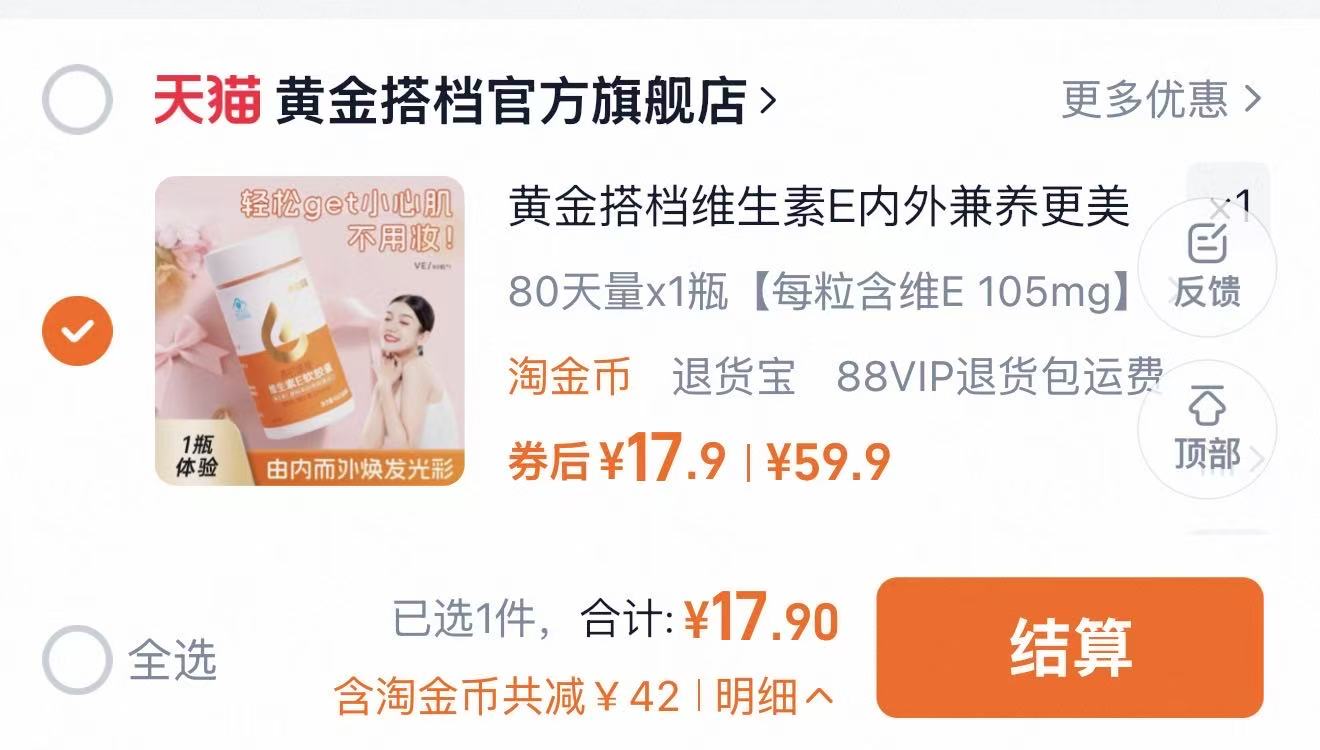 17.9亓 黄金搭档官旗 黄金搭档维生素E胶囊*80粒 口服/涂脸都可以 速度安排 好单发报员 2025年12月10日 15:32 0 举报 17.9亓【黄金搭档官旗】黄金搭档维生素E胶囊*80粒https://m.tb.cn/h.7Y63Uc0口服/涂脸都可以 速度安排 复制文案
