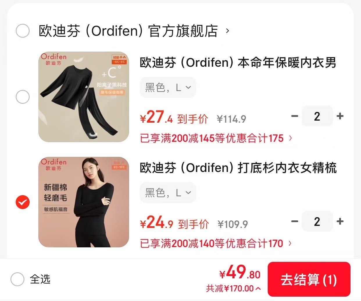 欧迪芬 本命年保暖内衣保暖套装,任选2套【54.8】