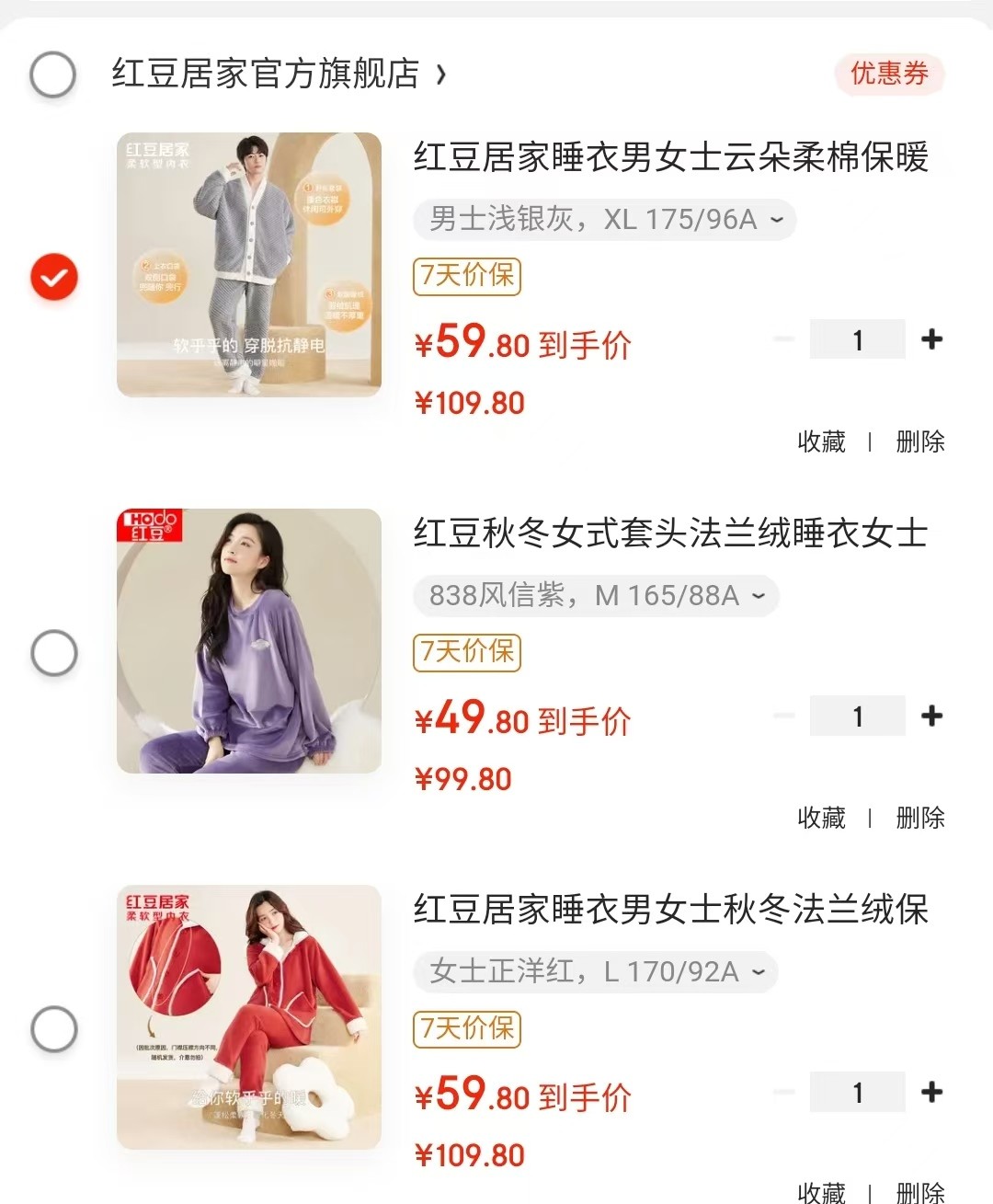 红豆 秋冬男女士套头法兰绒睡衣套装【59.8】