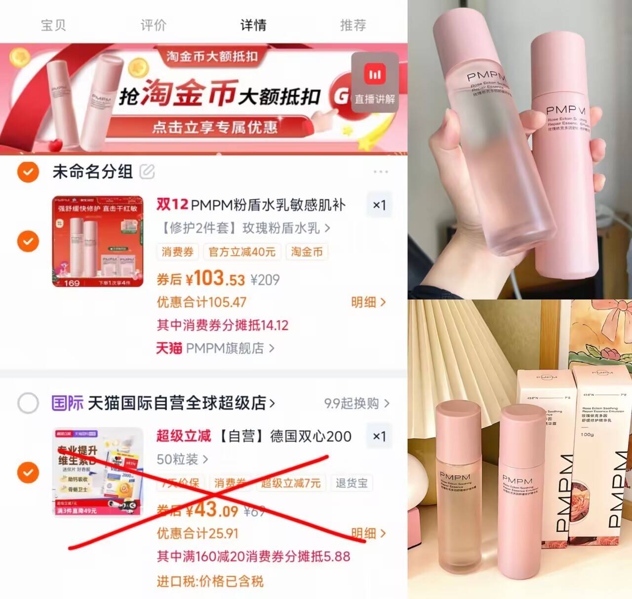 3、凑单,可退掉 PMPM玫瑰粉盾水乳103元