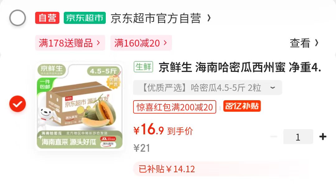 京鲜生 哈密瓜4.5-5斤