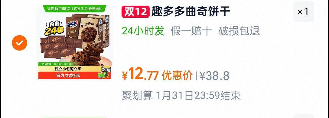 趣多多大块曲奇饼干黑巧克力味288g*2盒,领李金 详情页进金币页面加购 如有2福袋 凑标题下49-5后13.09 好单发报员 2025年12月11日 21:59 0 举报 趣多多大块曲奇饼干黑巧克力味288g*2盒,领李金详情页进金币页面加购如有2福袋 凑标题下49-5后13.09https://m.tb.cn/h.7c0A1eR 复制文案