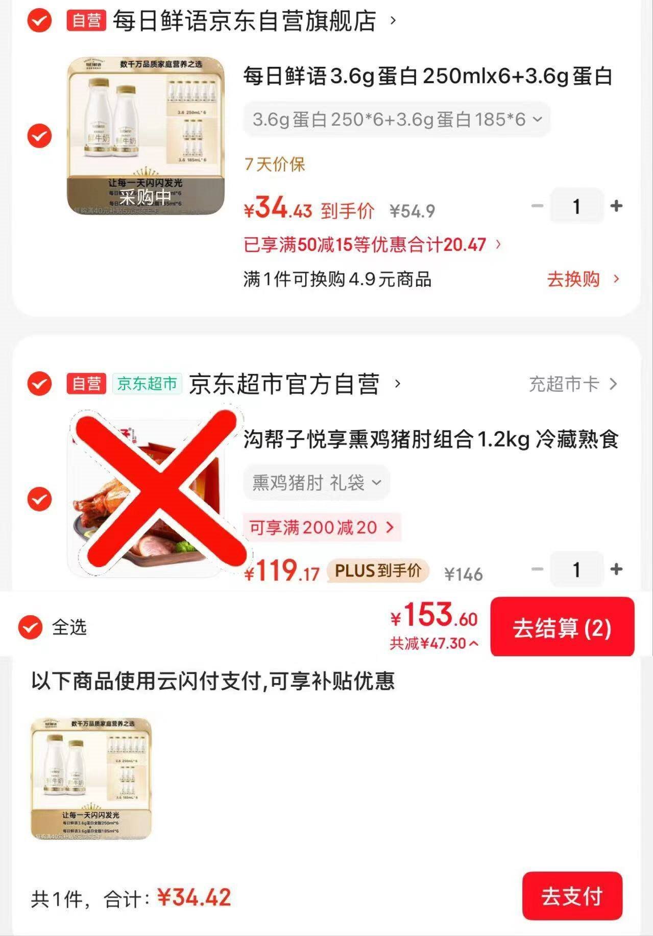 选云闪付支付折牛奶27.5亓