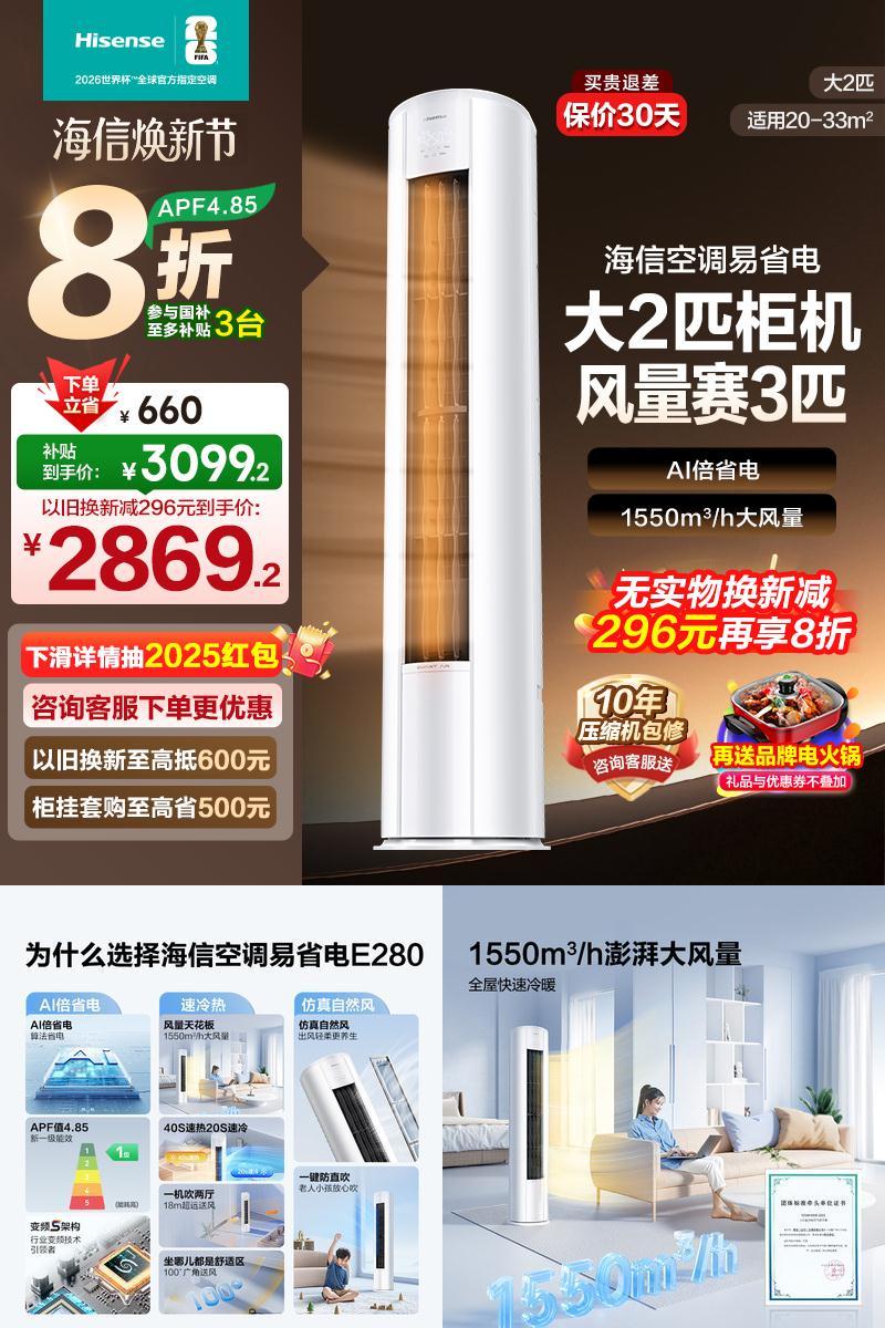 4999元 海信新风空调旗舰店 海信2匹易省电E280立式空调柜机家用一级能效客厅以旧换新补贴 好单发报员 2025年12月12日 10:49 0 举报 4999元 海信新风空调旗舰店海信2匹易省电E280立式空调柜机家用一级能效客厅以旧换新补贴https://m.tb.cn/h.7cRNCCY 复制文案