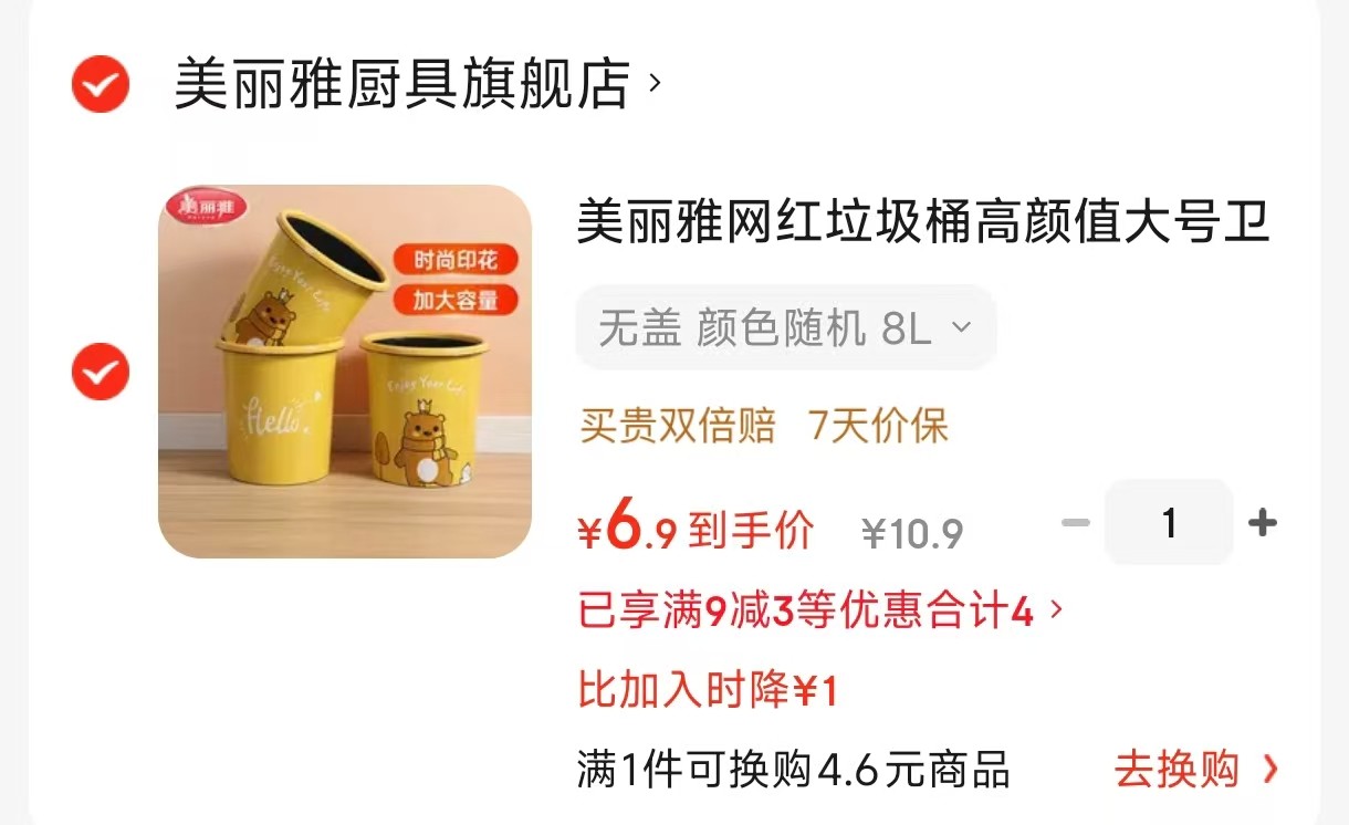 美丽雅 网红垃圾桶无盖 颜色随机 8L【6.9】