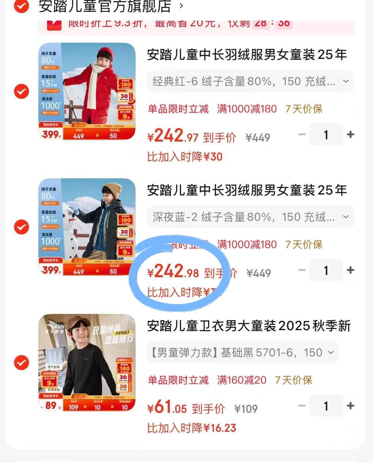 安踏儿童中长羽绒服244元