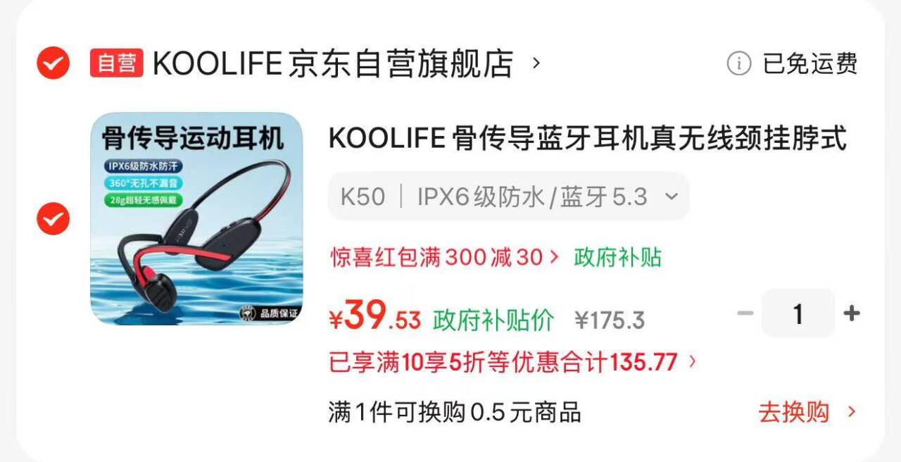 KOOLIFE骨传导蓝牙耳机真无线颈挂脖式跑步运动耳机