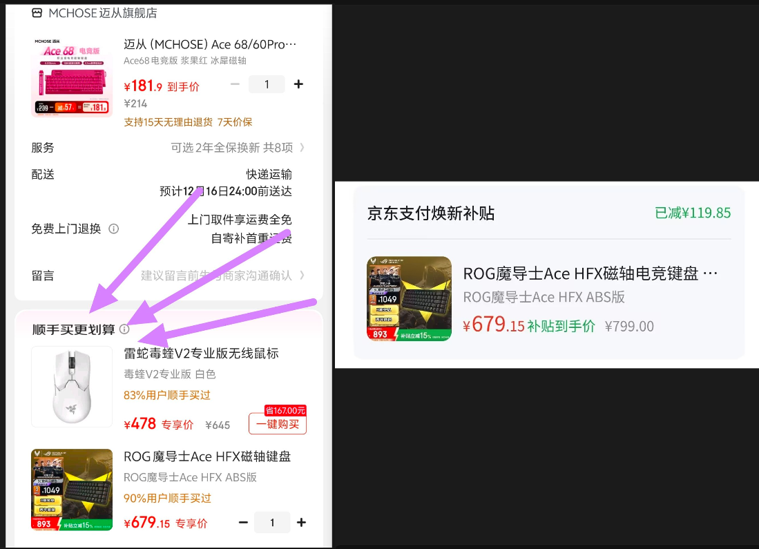 下蛋结蒜时如图---顺手买更划算---勾选一起下蛋--就行了, 所有的先一起苻,付完退了凑掸的