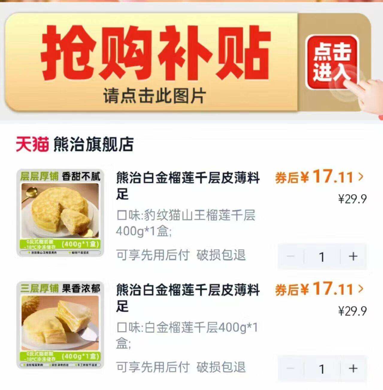 36.22元 拍2件 熊治旗舰店 叠加下拉详情淘金币 熊治白金榴莲千层蛋糕400g*2盒 好单发报员 2025年12月12日 20:33 0 举报 36.22元 拍2件【熊治旗舰店】【叠加下拉详情淘金币】熊治白金榴莲千层蛋糕400g*2盒https://m.tb.cn/h.7XplDqT https://m.tb.cn/h.7XplDsr 复制文案