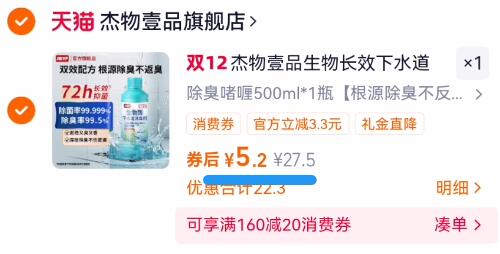 5.2亓速叠1亓首单 杰物壹品 管道除臭剂500ml 好单发报员 2025年12月12日 21:59 0 举报 5.2亓速叠1亓首单【杰物壹品】管道除臭剂500mlhttps://m.tb.cn/h.7XJHG7Y 复制文案