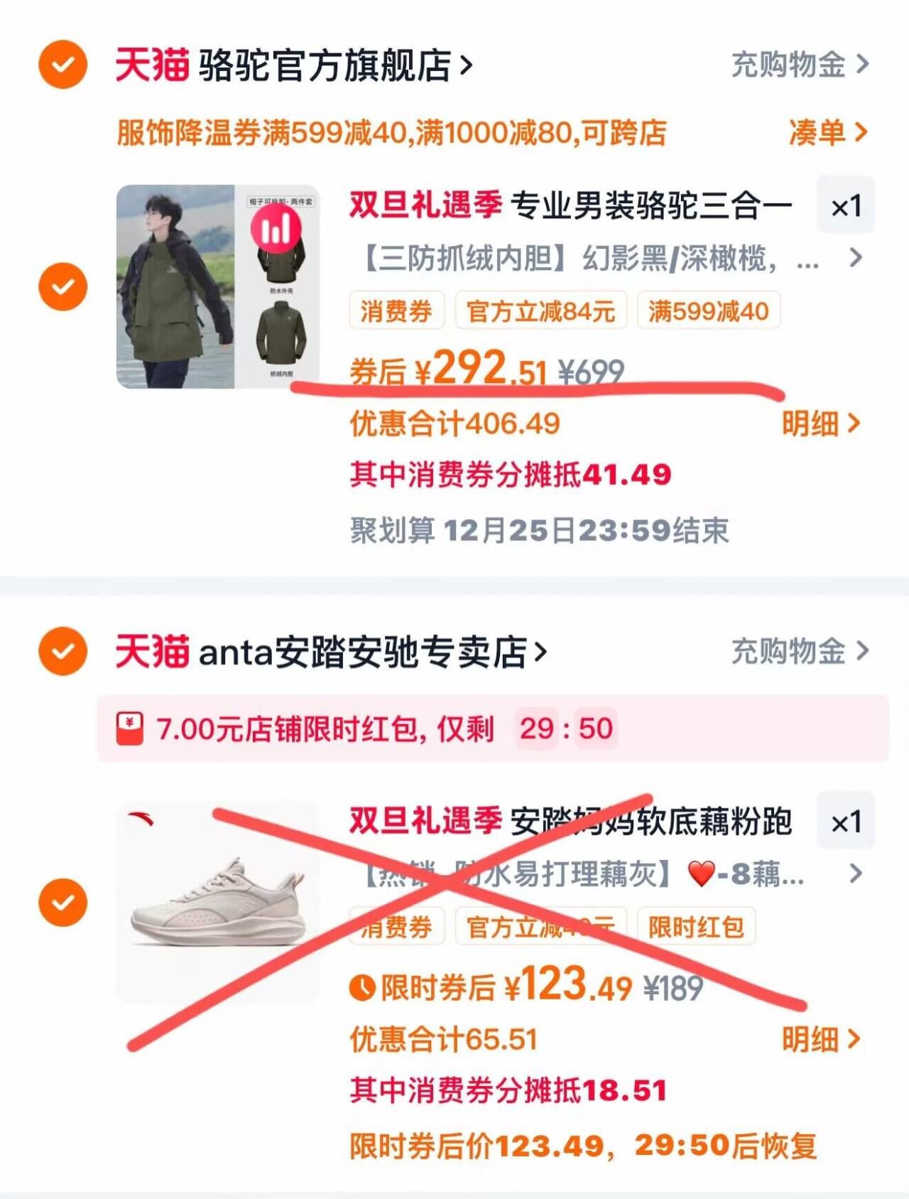 2、凑单商品 加车1件 先一起付款 再退凑单商品 - 好单发报员 2025年12月16日 00:36 0 举报 2、凑单商品 加车1件先一起付款 再退凑单商品https://m.tb.cn/h.727rzQ5-骆驼拒水三合一到手292.51元 复制文案