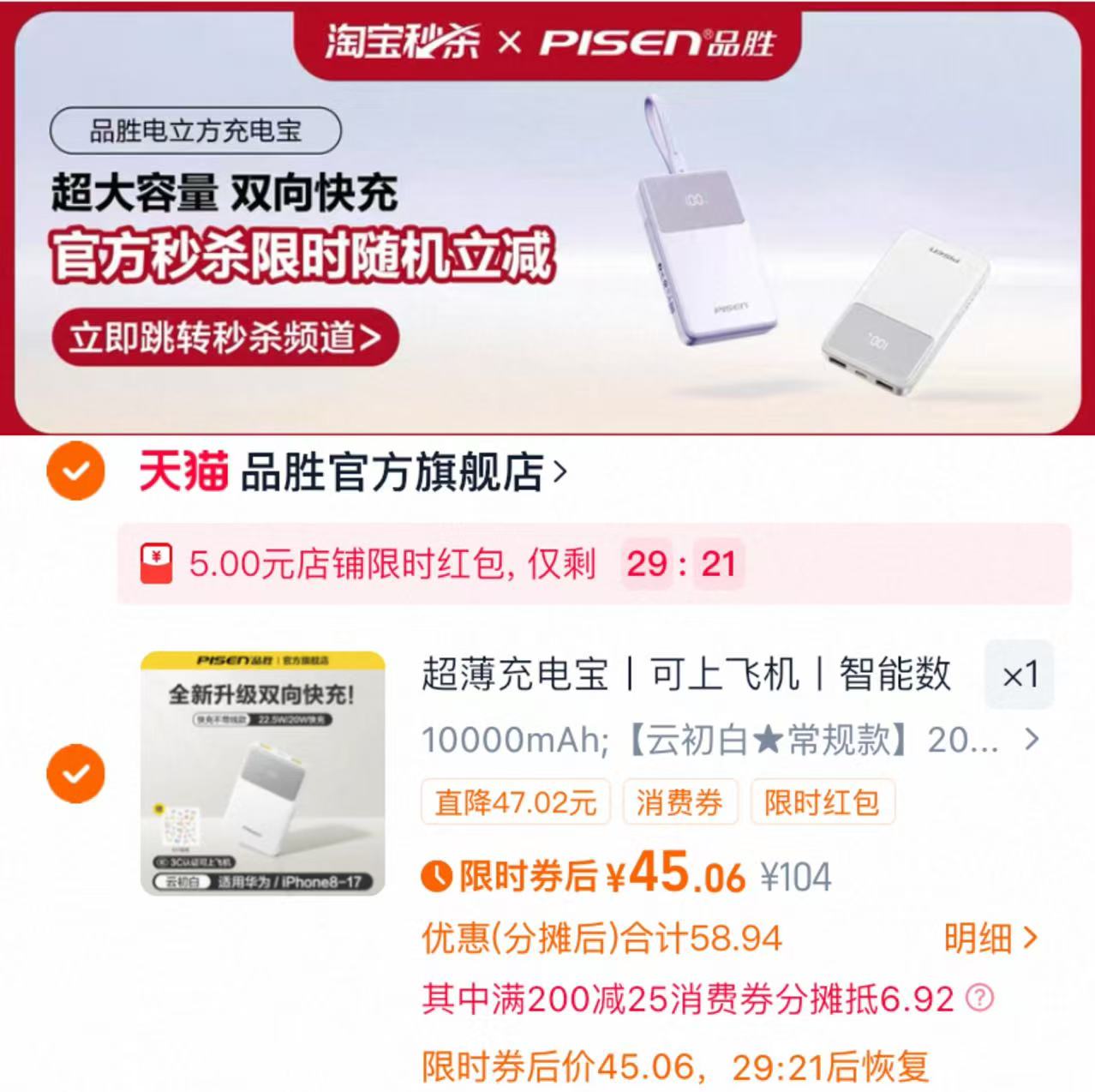 3、凑单加车1件 一起付款,然后退掉凑单 品胜双向快充充电宝到手 元 好单发报员 2025年12月16日 10:34 0 举报 3、凑单加车1件https://m.tb.cn/h.7WVuZq1一起付款,然后退掉凑单品胜双向快充充电宝到手 元 复制文案