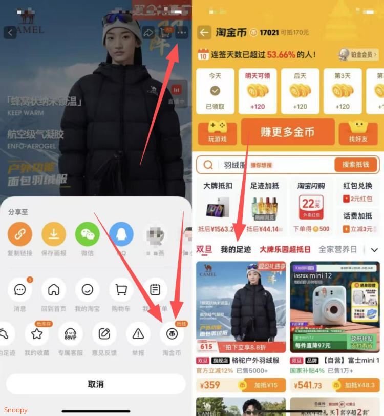 1.商品右上角3个点 选淘金币 再选 我的足迹-找到商品加车 - 好单发报员 2025年12月16日 10:35 0 举报 1.商品右上角3个点 选淘金币再选 我的足迹-找到商品加车-骆驼户外防风防泼水羽绒服【骆驼官方旗舰店】https://m.tb.cn/h.7dSXyE2需叠88领的480-60消费券 复制文案