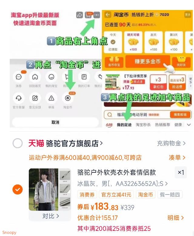 骆驼户外软壳登山服183元 需叠200-25消费券 淘金币 骆驼官方旗舰店好单发报员2025年12月16日 17:280举报 骆驼户外软壳登山服183元需叠200-25消费券 淘金币【骆驼官方旗舰店】-商品右上角3个点,选淘金币再选 我的足迹-找到商品拍下https://m.tb.cn/h.72DyNcp复制文案