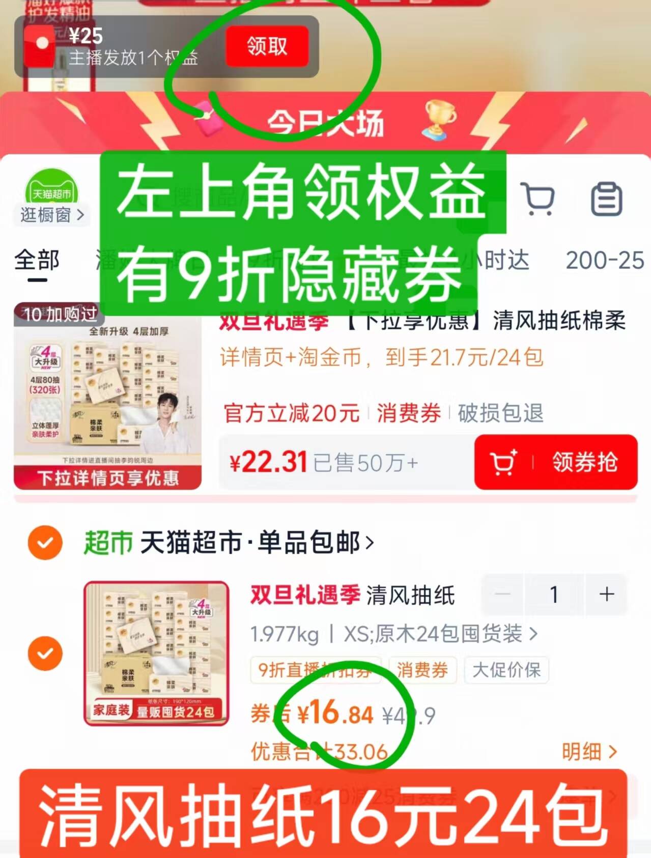 1、先领礼金,再下拉详情点击直播间,左上角领权益 有9折隐藏巻,加车1件