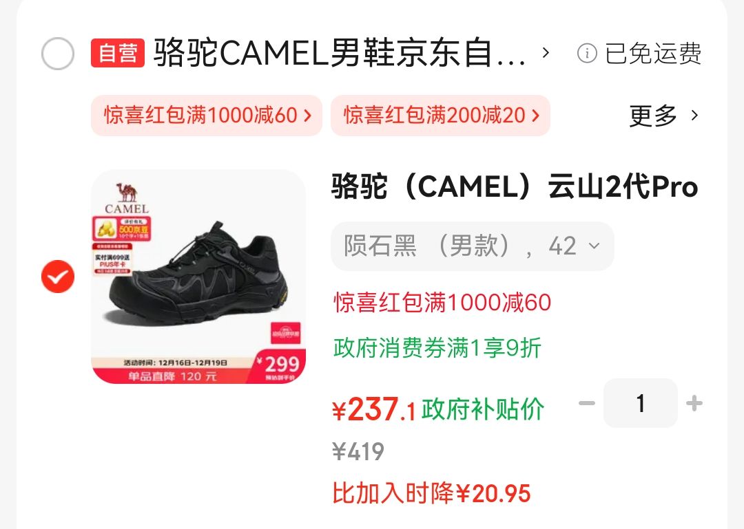 200-20券叠加页面9折消费券下单237元 骆驼新款又降价了