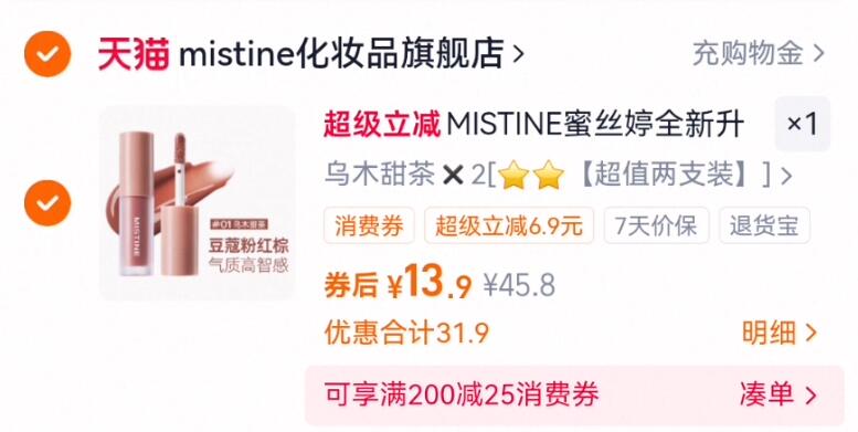 6.9亓bug锁!入会拍 拍第2选项13.9亓2支 蜜丝婷 乌木甜茶唇釉*2支 好单发报员 2025年12月18日 00:32 0 举报 6.9亓bug锁!入会拍拍第2选项13.9亓2支【蜜丝婷】乌木甜茶唇釉*2支https://m.tb.cn/h.7WLB6uY 复制文案