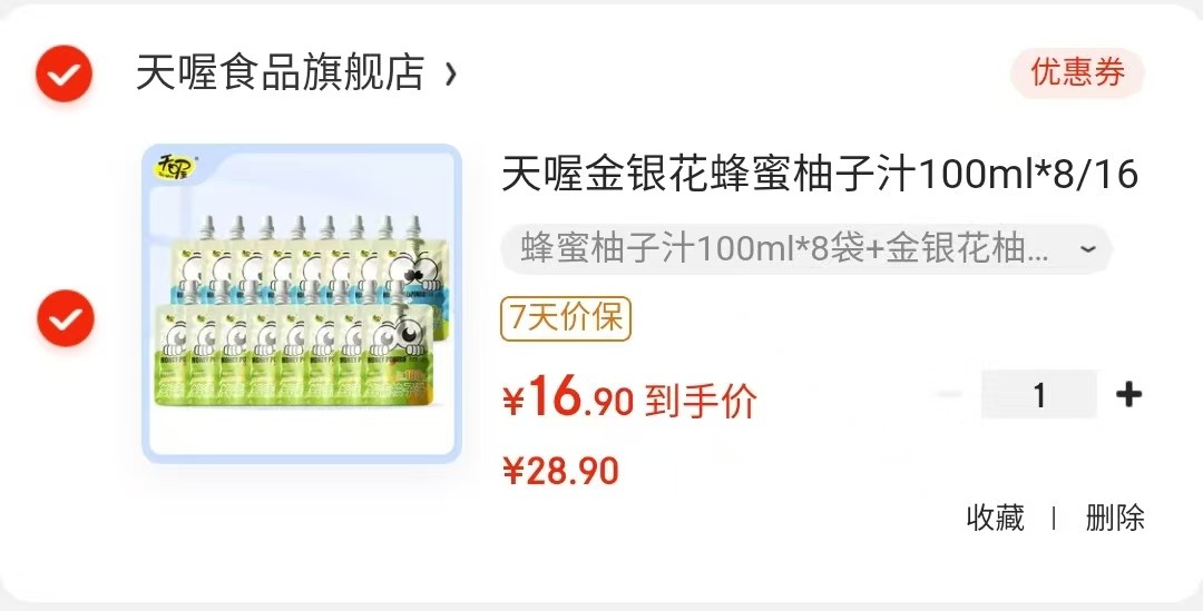 天喔 蜂蜜柚子汁100ml*8袋 金银花柚子汁100ml*8袋【16.9】