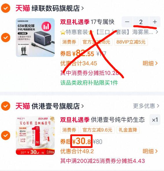 2、凑单商品加购 2件 一起付款然后退掉凑单