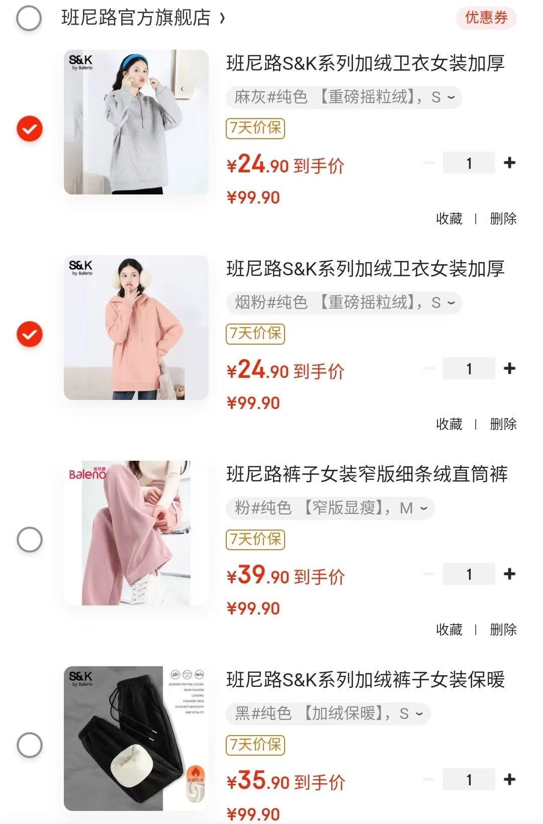 领190-150 班尼路 加绒卫衣女装加厚羊羔绒,拍2件 49.8 班尼路 裤子女装窄版细条绒直筒裤 39.9