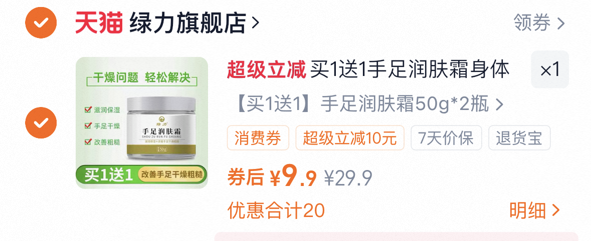 有需速, 拍下9.9 绿力手足润肤霜50g*2罐好单发报员2025年12月20日 15:220举报 有需速, 拍下9.9绿力手足润肤霜50g*2罐https://m.tb.cn/h.73Er3E6复制文案