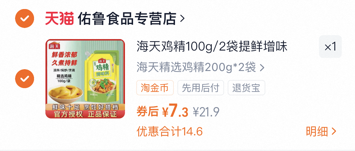 去淘金币拍 7.3 海天鸡精200g*2袋
