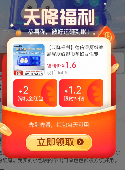 1.6亓速限时礼金 德佑湿厕纸20抽