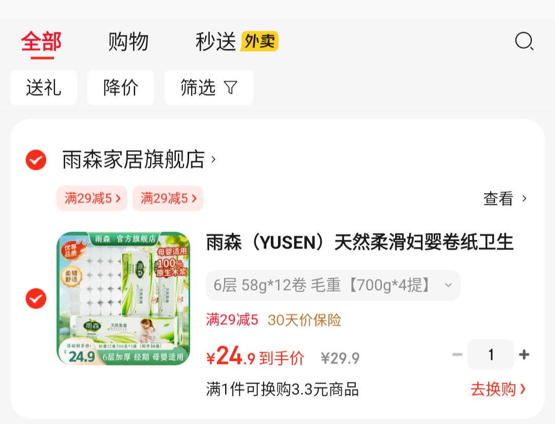 雨森 (YUSEN)天然柔滑妇婴卷纸 58g*48卷【24.9】