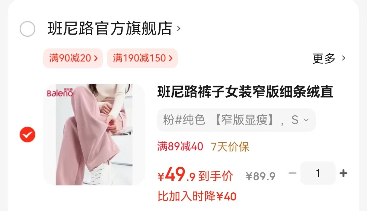 班尼路 裤子女装窄版细条绒直筒裤【49.9】