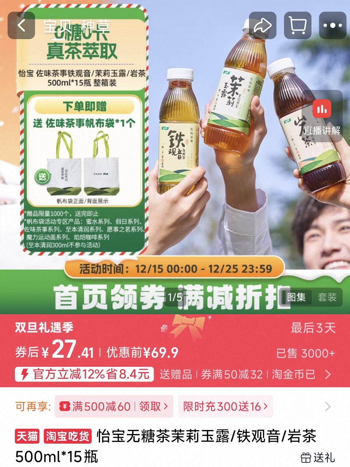 1.8一瓶怡宝无糖茶 茉莉玉露/铁观音/岩茶任选 500ml*15瓶 帆布包29元好单发报员2025年12月23日 19:270举报 1.8一瓶怡宝无糖茶茉莉玉露/铁观音/岩茶任选500ml*15瓶 帆布包29元提交订单,显示帆布包赠品https://m.tb.cn/h.7fu5WMT复制文案