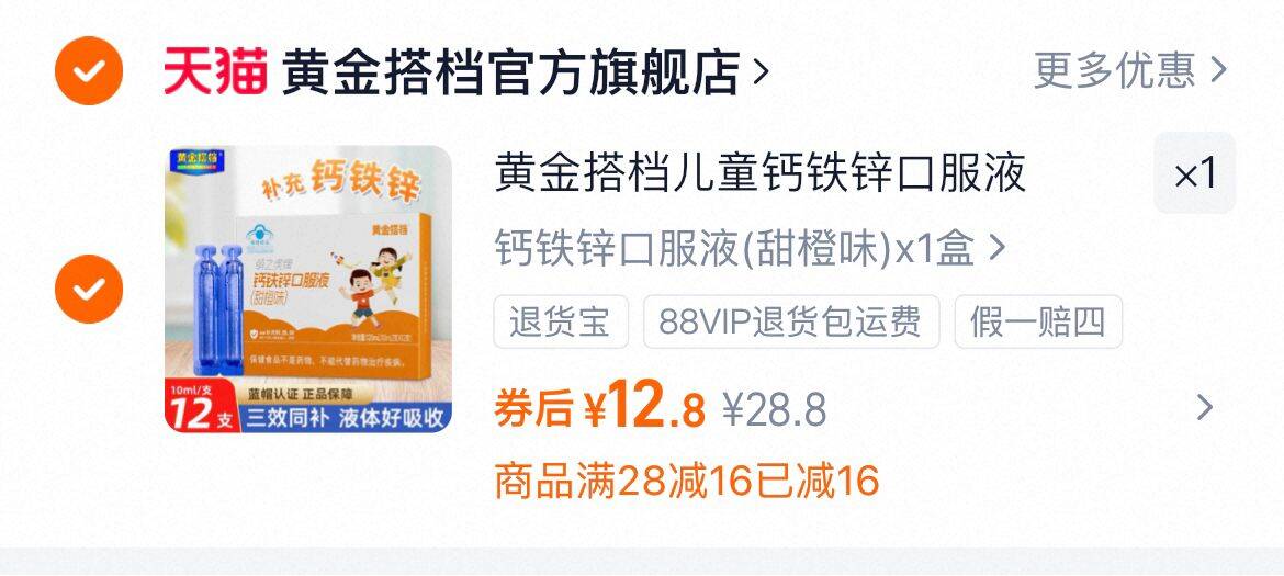 12.8亓 黄金搭档 钙铁锌口服液12支