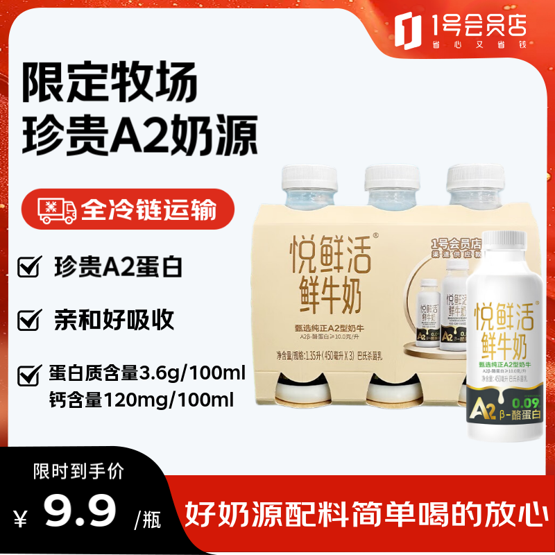 【JD自营】悦鲜活 A2β-酪蛋白鲜牛奶 450ml 3瓶